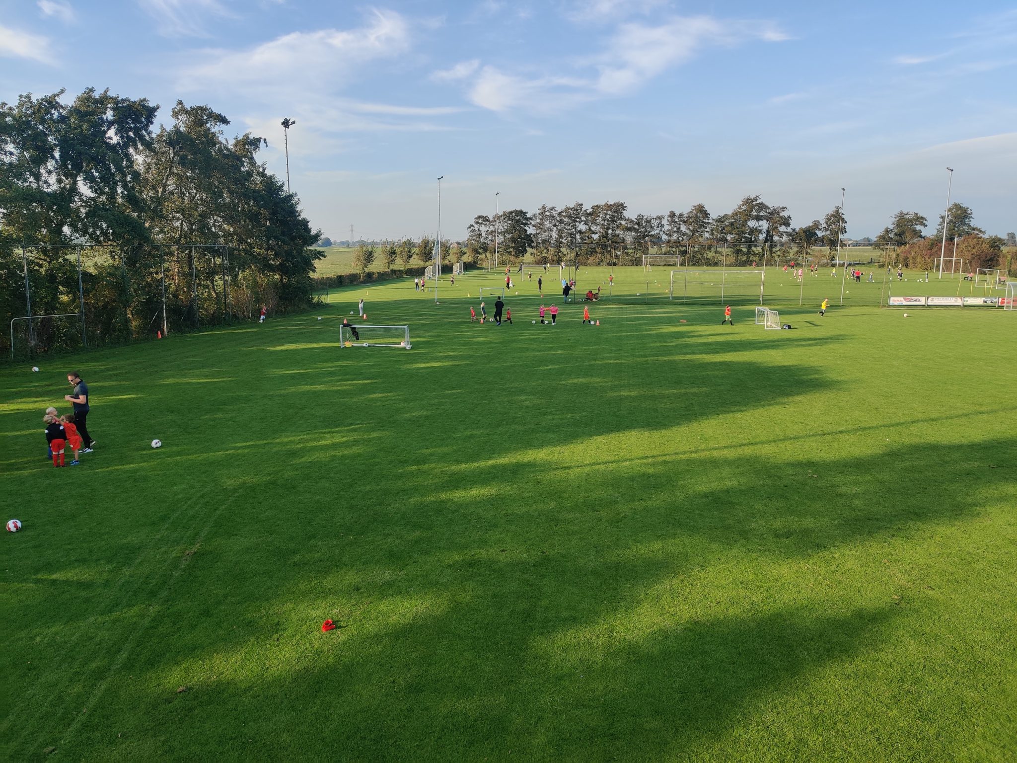 Al meermaals had ik te horen gekregen dat ik een keer moest komen kijken bij de trainingen op de dinsdagmiddag tussen 17.00 uur en 18.00 uur. Men had gelijk. Het was een klein genot om te zien dat er ruim 60 jongens/meisjes tegelijk aan het trainen waren. Elk team had 1 of zelfs 2 enthousiaste trainers, de jeugd coördinator was aanwezig voor het overzicht en ondersteuning, de velden lagen er prachtig bij en het weer was superlekker. Na een rondje langs de veldjes klom ik nog even op het dak voor het bewijsmateriaal.